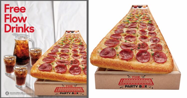 Pizza Hut telah mencipta tawaran minuman ringan tanpa had dengan setiap pembelian “The Long Party Box”. Piza sepanjang satu meter yang berharga RM99 untuk hidangan ala carte ini akan menjadi menu tetap di Pizza Hut untuk makan di restoran dan bawa pulang.