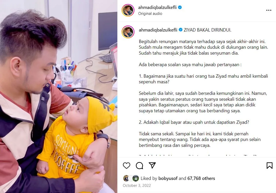 Iqbal juga turut berkongsi satu video di laman Instagram miliknya dia mengambil seorang anak angkat lelaki pada 30 April 2022.
