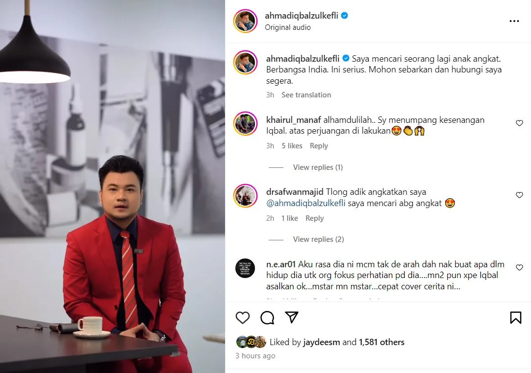 Jelas Iqbal, perkara tersebut bukanlah untuk menarik perhatian mahupun kandungan untuk “viral”, tetapi dia minta jasa baik masyarakat untuk dapat menolongnya mendapatkan anak tersebut.