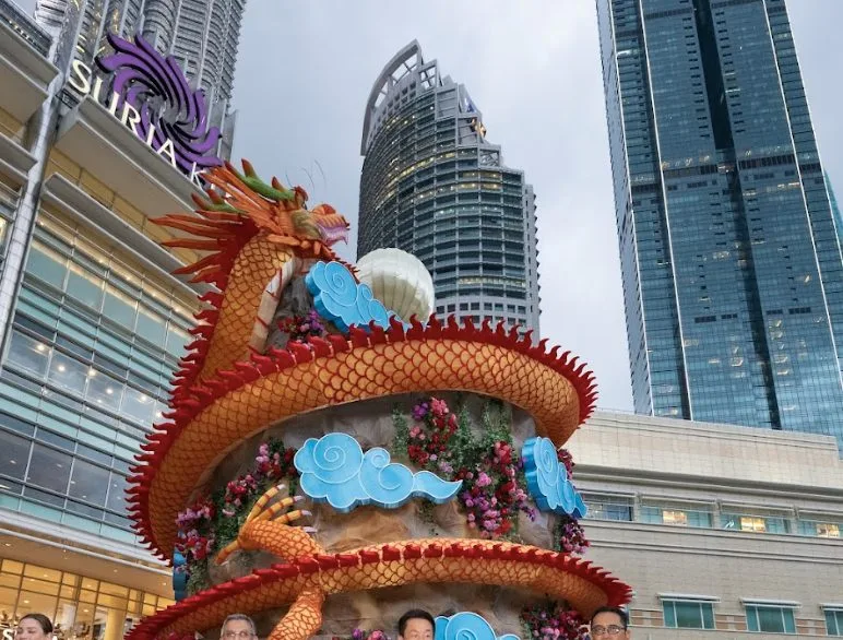 Suasana Tahun Baru Cina di Suria KLCC semakin memukau dengan kehadiran replika naga 3D setinggi 60 kaki yang memancarkan keindahan di sini.