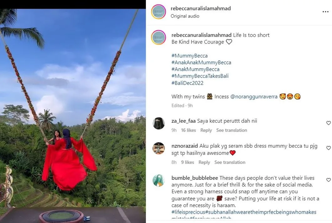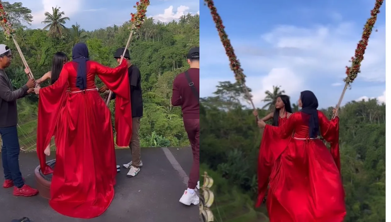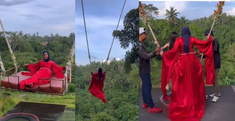Dalam video yang dimuat naik oleh Rebecca tersebut, dia kelihatan sedang menaiki buaian di Bali yang menjadi tempat tumpuan pelancong sambil memakai baju bewarna merah.