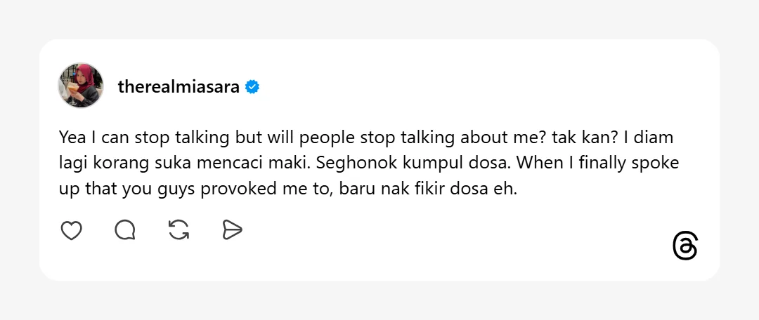 Saya diam lagi korang suka mencaci maki. Seronok kumpul dosa. Bila saya akhirnya bersuara mengenai apa yang kalian provokasi itu, baru nak fikir dosa eh.”-tulis Mia di Threads