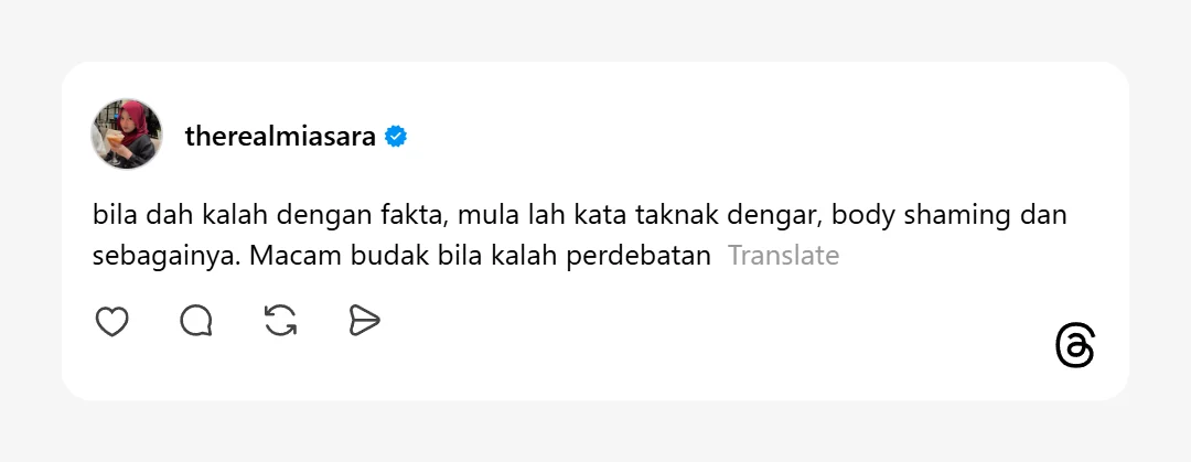 “Bila dah kalah dengan fakta, mula lah kata tak nak dengar, body shaming dan sebagainya. Macam budak bila kalah perdebatan.”-tambah Mia lagi
