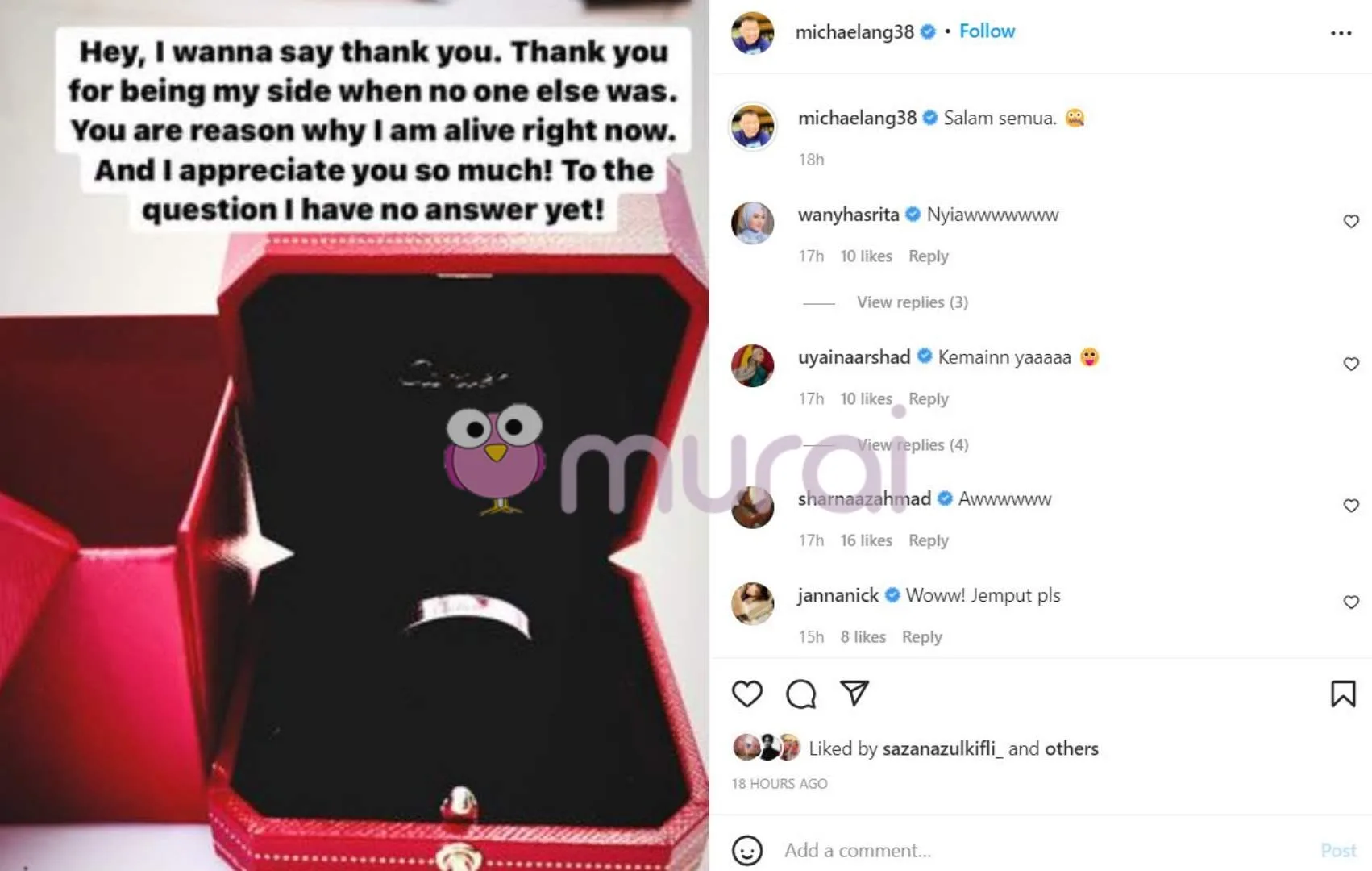 Pengarah terkenal, Michael Ang tampil meninggalkan tanda tanya pada peminat dan rakan selebriti apabila dilihat memuatnaik foto cincin di Instagram.