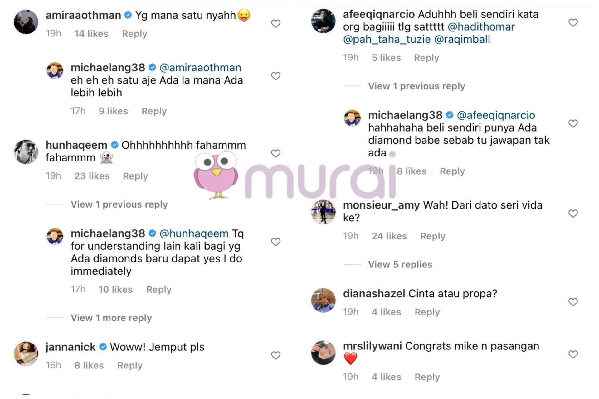 Meninjau ke ruangan komen,rata-rata peminat serta rakan artis terkejut dengan perkongsian tersebut dan tertanya adakah Michael memberi petunjuk akan menamatkan status bujangnya.