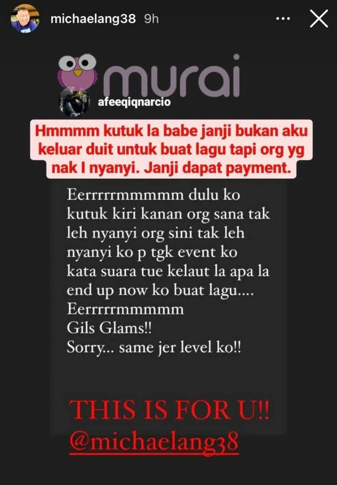 “Hmm kutuk la babe janji bukan aku keluar duit untuk buat lagu tapi rang yang nak I nyanyi. Janji dapay payment.”-Jelas Michael Ang