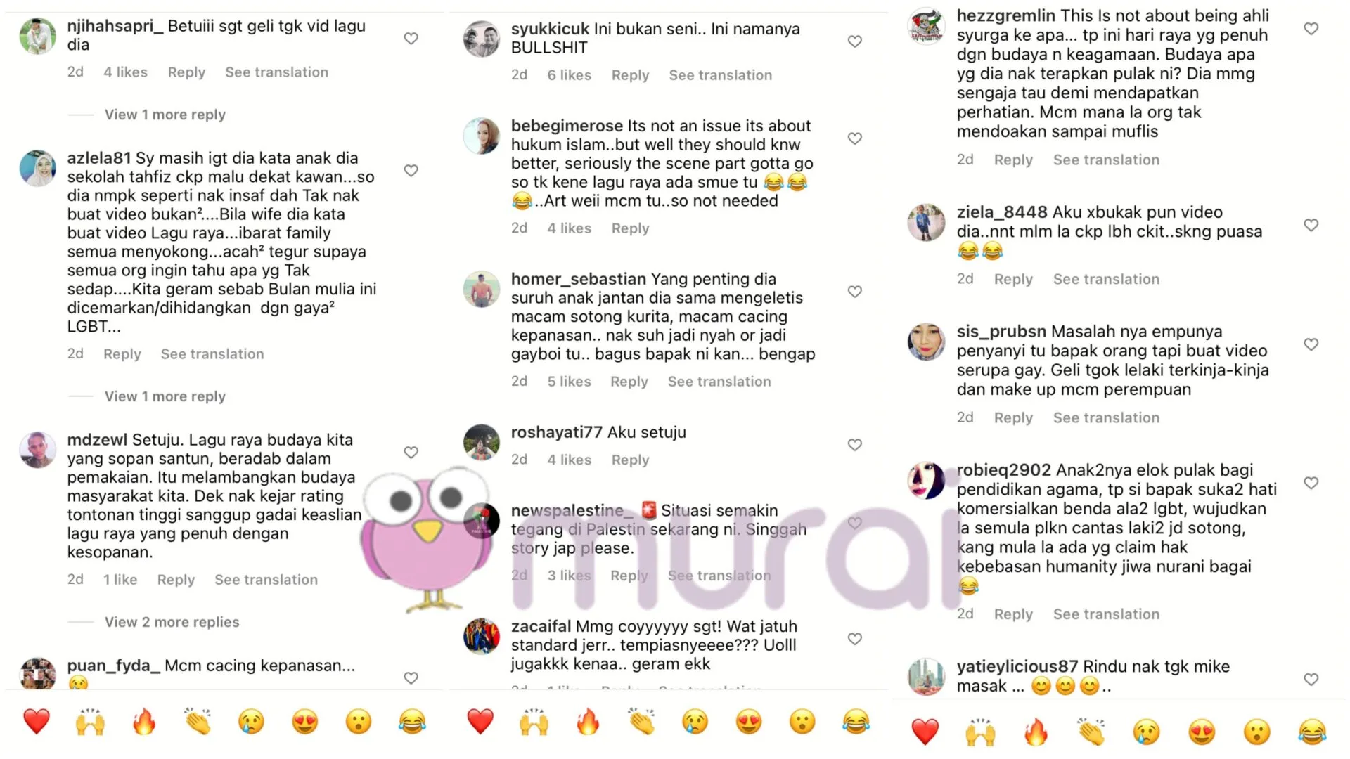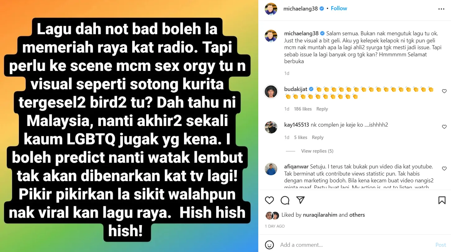 “Dah tahu ni Malaysia, nanti akhir-akhir sekali kaum LGBTQ juga yang kena. I boloeh predict nanti watak lembut tak akan dibenarkan kat tv lagi! Pikir-pikirkan la sikit walaupun nak viral kan lagu raya. Hish hish hish”-Michael Ang