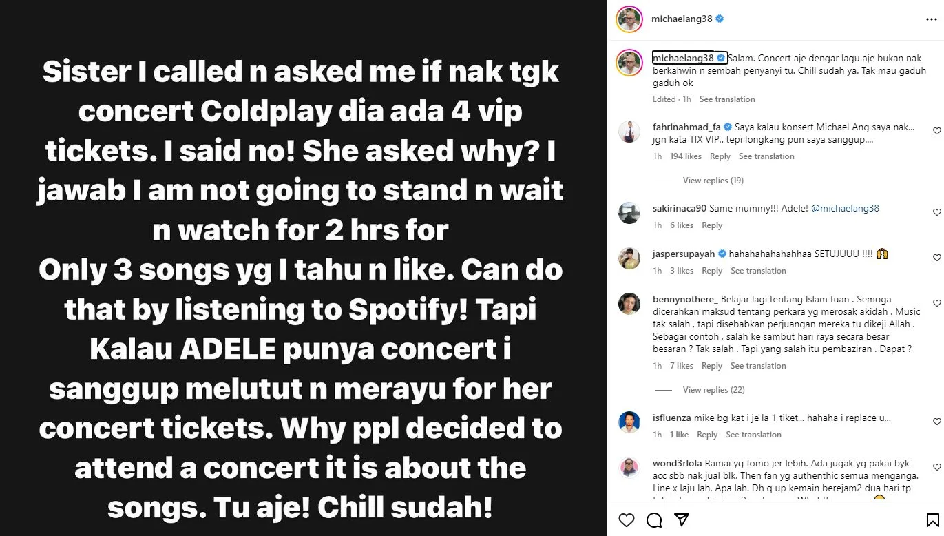 Kenapa orang membuat keputusan untuk hadir ke konsert, ianya mengenai lagu. Tu je! Chill sudah ya!. Tak mau gaduh-gaduh okay.-tulis Michael di Instagram