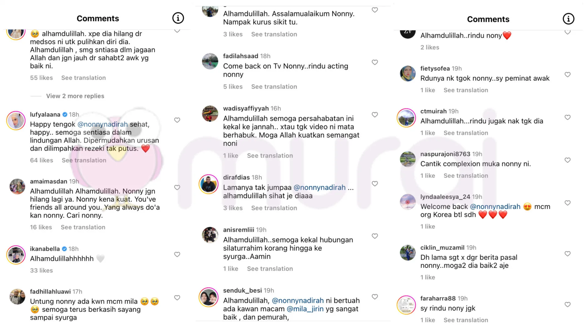 “Happy tengok Nonny Nadirah sihat, happy. Semoga sentiasa dalam lindungan Allah. Dipermudahkan urusan dan dilimpahkan rezeki tak putus.”-Lufya Omar
