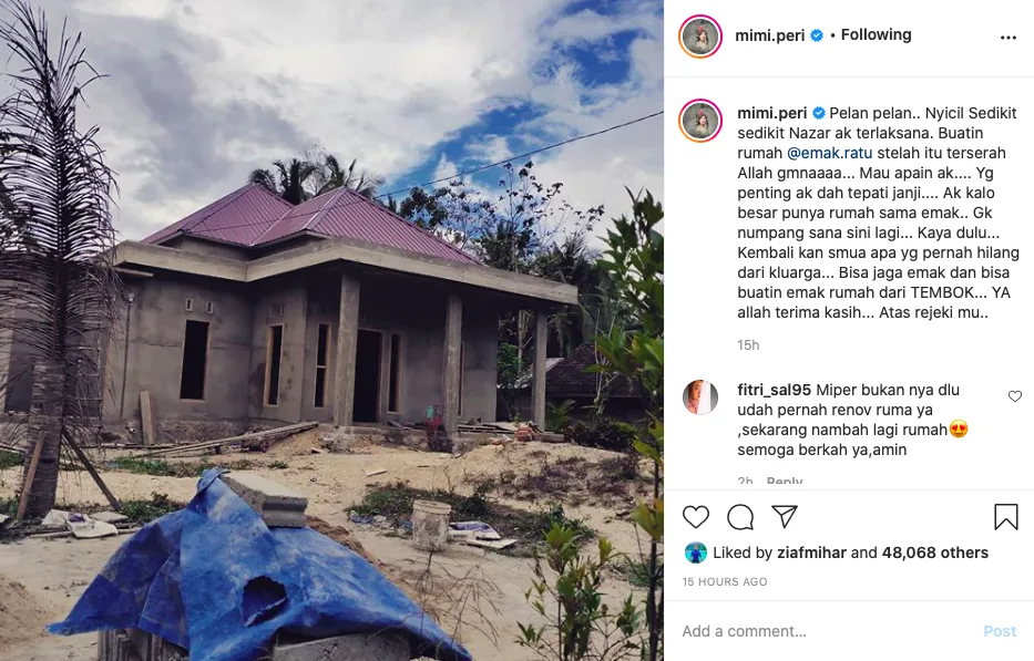 Kini, semua itu hanya tinggal kenangan kerana Mimi berjaya mengubah kehidupan dan merealisasikan imipiannya termasuklah membelikan rumah buat keluarga. Jika dahulu, Mimi sekadar mengubah suai rumah mereka, terbaru menerusi perkongsian Mimi di laman Instagram dia mendedahkan telah membeli sebuah lagi rumah buat ibunya. Jelas Mimi, impiannya dahulu sedikit sebanyak dapat direalisasikan.