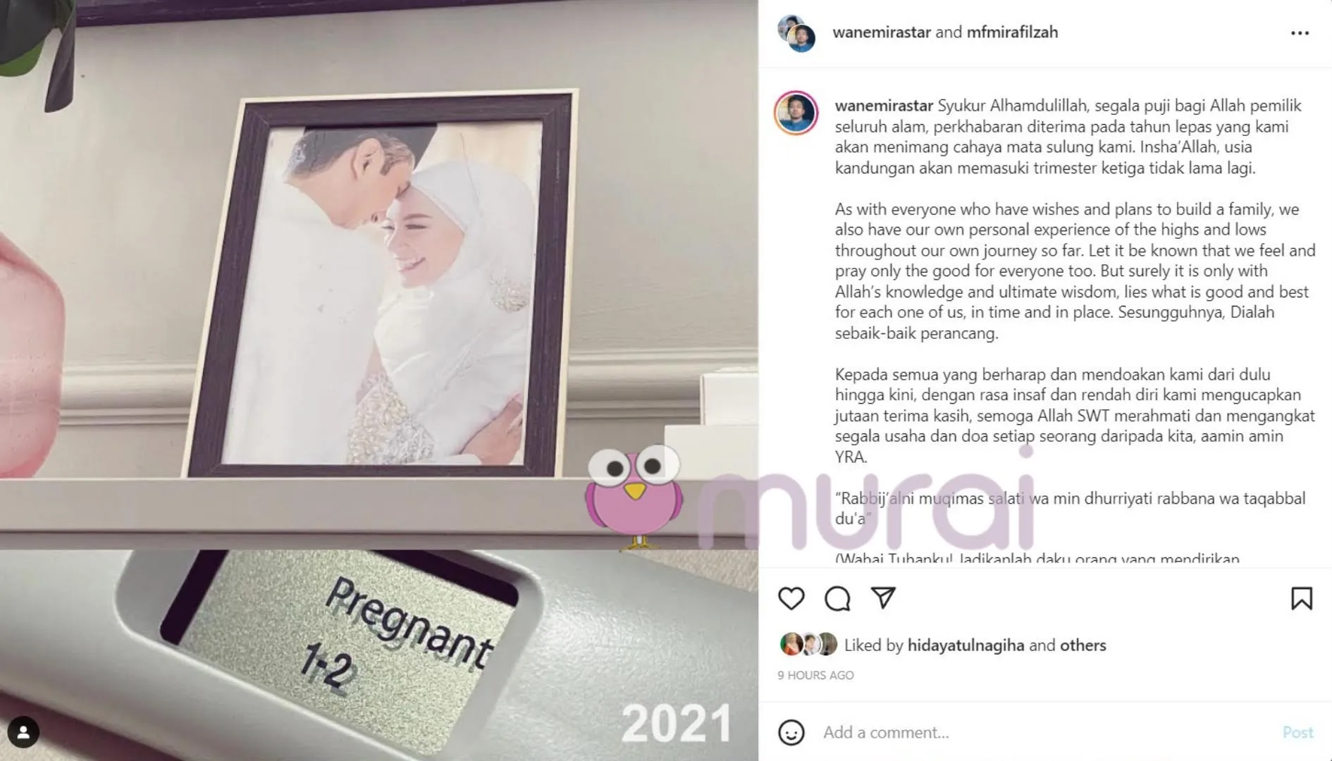 “Syukur Alhamdulillah, segala puji bagi Allah pemilik seluruh alam, perkhabaran diterima pada tahun lepas yang kami akan menimang cahaya mata sulung kami. Insha’Allah, usia kandungan akan memasuki trimester ketiga tidak lama lagi”- tulis Mira