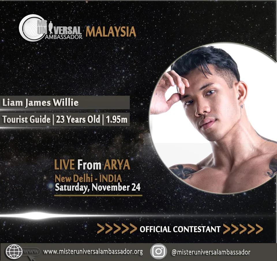 Diwakili oleh pemuda yang berusia 23 tahun ini, Liam James Willie telah berada di New Delhi, India bagi bersaing bersama Mister Universal Ambassador yang lain. Menerusi beberapa cabaran, pemenang akan meraih gelaran Mister Universal Ambassador 2018. Menurut sumber, nampaknya Liam merupakan antara top 6 kebanyakan cabaran yang sudah dipertandingkan. Tahniah diucapkan!