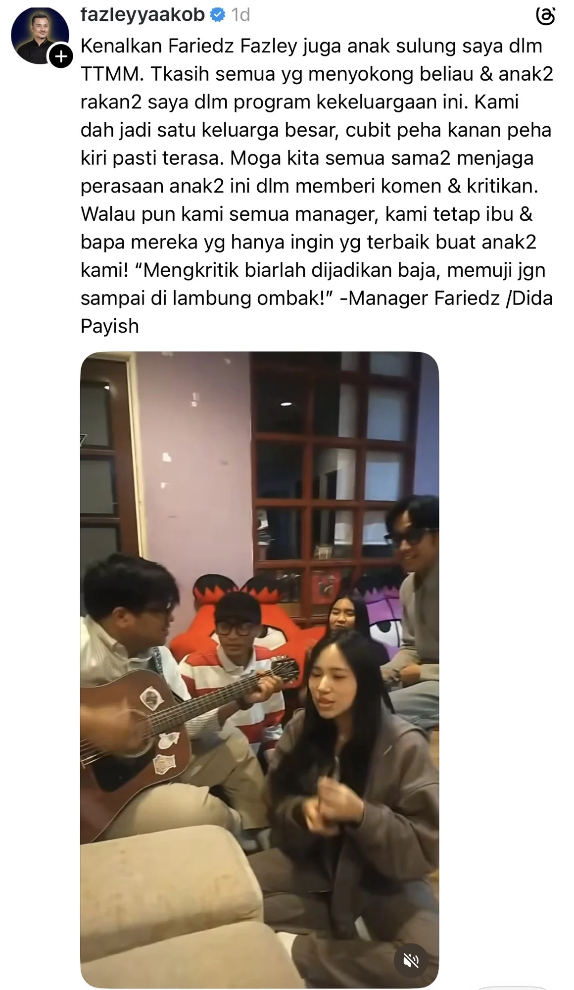 Fazley menerusi hantaran di Thread, turut memberikan ucapan terima kasih buat semua pihak yang menyokong dia dan anaknya, Fariedz yang menjadi salah seorang peserta Talk To My Manager Musim 2.