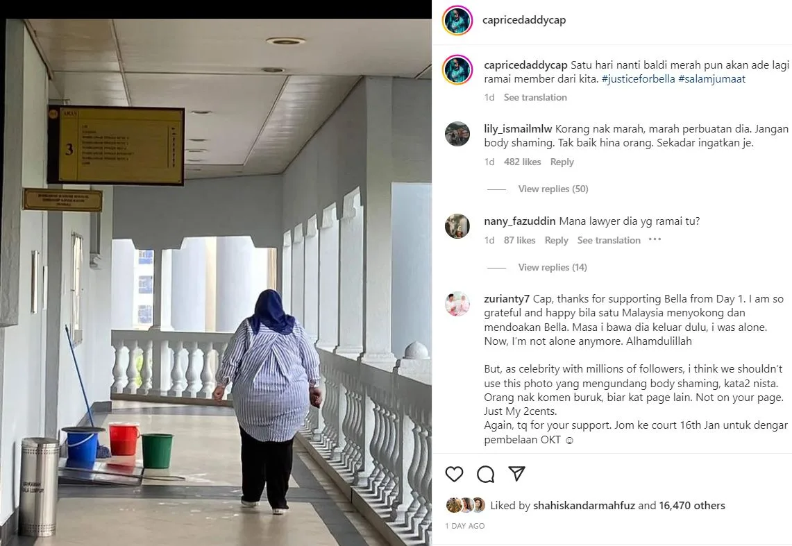 Dalam gambar tersebut, Caprice ada memuat naik gambar Siti Bainun dari belakang yang memakai baju berbelang biru putih.