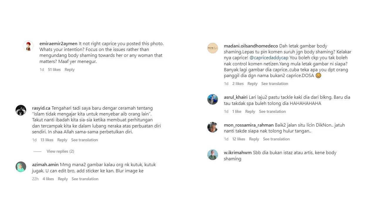 Melihat diruangan komen, ada sesetengan netizen yang memohon Caprice untuk memadam gambar tersebut untuk elakkan dari berlakunya ‘body shamming’ terhadap Bainun.