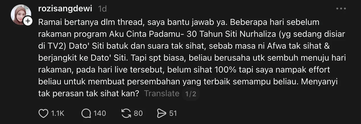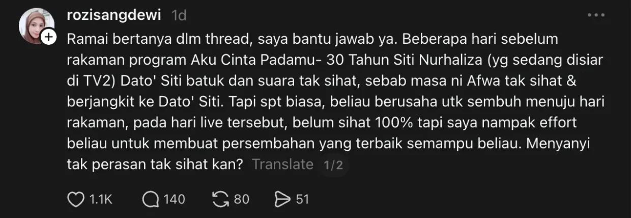 “Ramai bertanya dalam thread, saya bantu jawab ya. Beberapa hari sebelum rakaman program Aku Cinta Padamu – 30 Tahun Siti Nurhaliza (yang sedang disiarkan di TV2), Dato’ Siti batuk dan suara tak sihat, sebab masa ni Afwa tak sihat & berjangkit ke Dato’ Siti.”