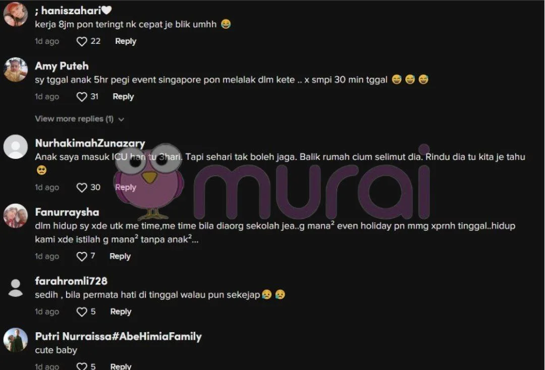 Menjengah ke ruangan komen, ramai yang turut sebak apabila melihat video yang telah dikongsi di tiktok. Ada juga berkongsi rasa yang sama apabila terpaksa berjauhan dengan anak walaupun dalam jangka masa yang sekejap.