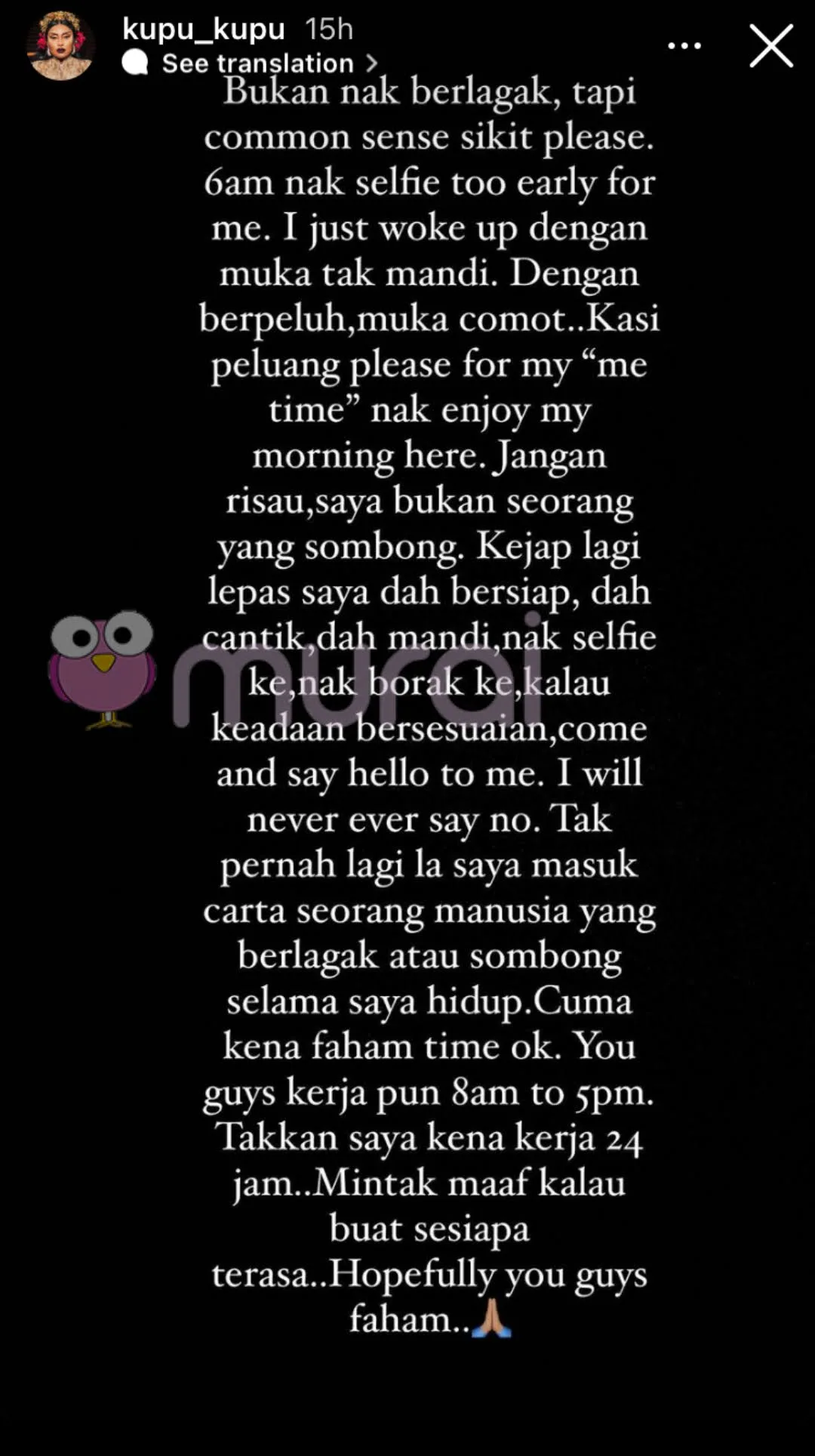 “Cuma kena faham time okay. You guys kerja pun 8 a.m to 5 p.m. Takkan saya kena kerja 24 jam. Minta maaf kalau buat sesiapa terasa. Hopefully you guys faham.”-Nabila Huda