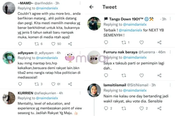 “Anda berfikiran matang. Ahli politik datang dan pergi. Kita mesti memilih mereka yang benar berkhidmat untuk kita. Bukannya yang jenis 5 tahun sekali baru nampak muka, komen di media entah apa-apa” ciap pengguna pertama
