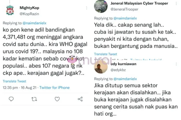 “Jika ditutup semua sektor, kerajaan akan disalahkan. Jika buka, kerajaan juga disalahkan. Senang cerita susah nak puaskan hati orang” ciap pengguna ketiga
