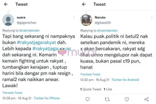 “Kalau puak politik ni betul-betul nak selesaikan pandemik ni, mereka tak akan bercakaran. Rakyat sedang lihat UMNO menggelupor nak dapat kuasa, bukan pasal Covid-19 pun hanat” ciap pengguna empat