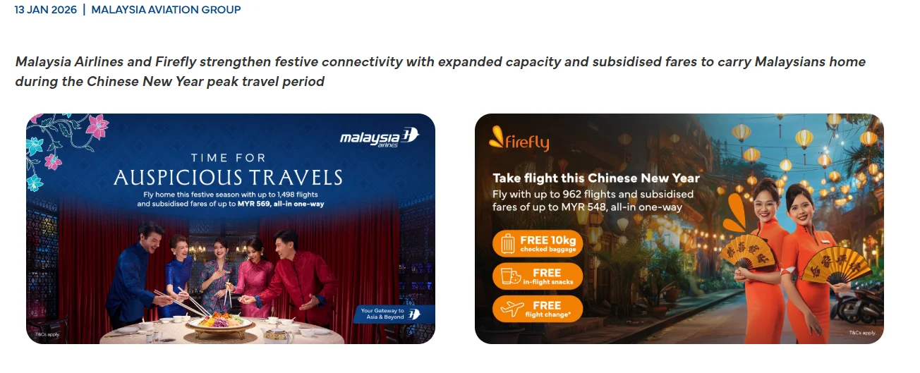 “Tambang disubsidi ini melengkapkan jadual penerbangan perayaan yang diperluas, membantu meringankan kos perjalanan sambil memastikan akses lebih luas kepada kapasiti meningkat dan ketersambungan yang boleh dipercayai sepanjang tempoh puncak perjalanan Tahun Baharu Cina.”