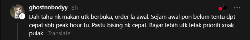 Meninjau ke ruangan komen, rata-rata netizen bersetuju dengan pandangan rider tersebut. Ada yang menyatakan bahawa pesanan untuk berbuka sepatutnya dibuat lebih awal bagi mengelakkan kesesakan pada waktu puncak.