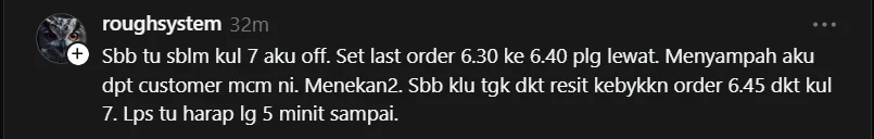 “Aku pun tak faham kenapa pukul 7 baru ramai order. Macam semua orang expect rider boleh ambil dan hantar terus,”