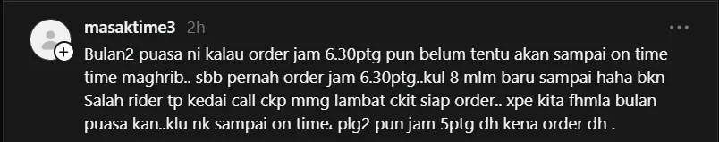 Seorang netizen menceritakan bahawa dia pernah membuat pesanan sekitar jam 6.30 petang tetapi makanan hanya tiba sekitar jam 8 malam. Namun dia tidak menyalahkan rider kerana restoran sendiri memaklumkan pesanan mengambil masa lebih lama untuk disiapkan.