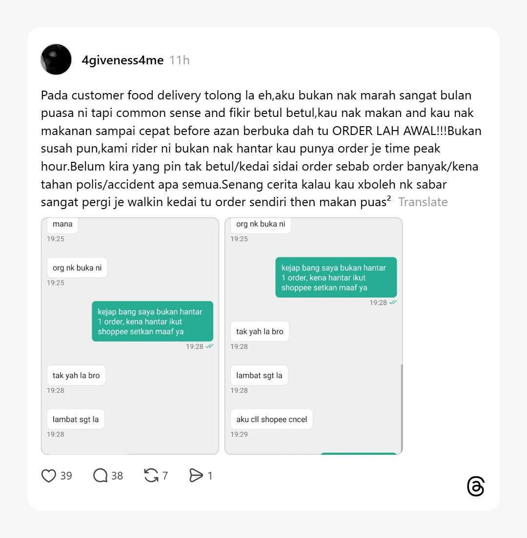 Baru-baru ini, satu perkongsian daripada seorang rider di Thread mencetuskan perbincangan hangat apabila dia meluahkan rasa kecewa terhadap sikap segelintir pelanggan yang membuat pesanan terlalu lewat tetapi mengharapkan makanan sampai sebelum azan Maghrib.