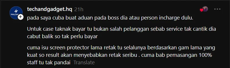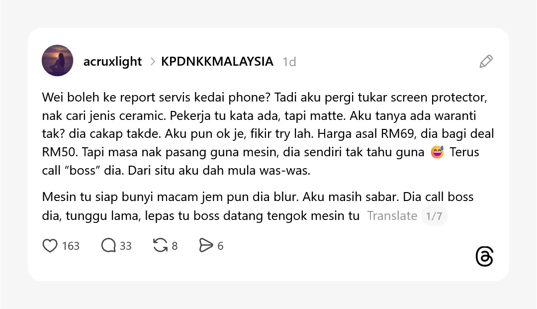 Tular satu perkongsian di media sosial apabila seorang individu meluahkan rasa kecewa selepas menerima servis yang dianggap tidak profesional ketika menukar pelindung skrin telefon.