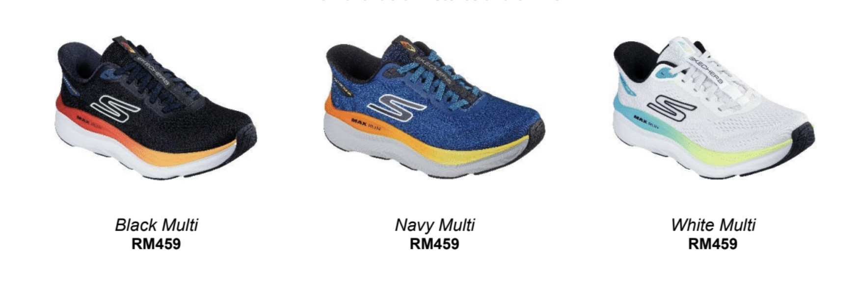 Bagi yang berminat, Max Run kini dijual dari RM 439, dengan pelancaran tambahan pada 17 Oktober 2025. Boleh didapati di butik Skechers terpilih seperti Pavilion Bukit Jalil, Pavilion Damansara Heights, Pavilion KL, Suria KLCC, The Exchange TRX Mall dan 1 Utama Shopping Centre, atau secara online di Skechers.com.my.
