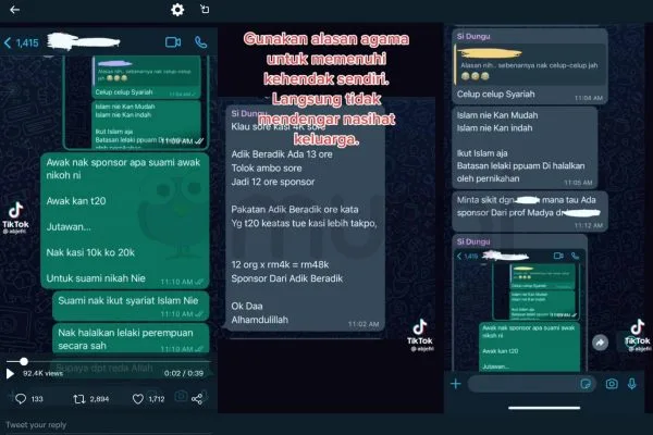 Tetapi tanpa rasa segan silu individu tersebut menghantar mesej kepada isteri dan juga adik-beradik untuk menaja majlis atas nama mengikut sunnah dan agama.