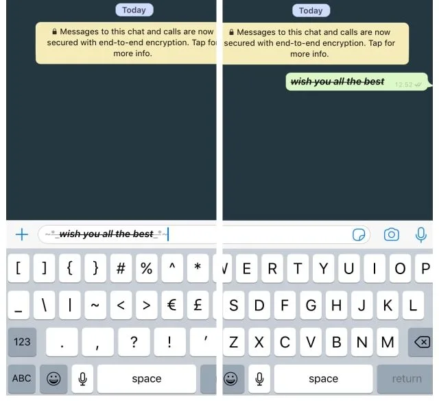 Anda juga boleh mengaplikasikan format bold, italic, dan strikethrough dalam teks sekaligus. Cranya, anda hanya perlu meletakkan simbol garisan melengkung (~), simbol (*), dan underscore (_) pada kiri teks. Pada kanan teks pula, simbol urutan teks mesti terbalik dari urutan yang ada di kiri teks.