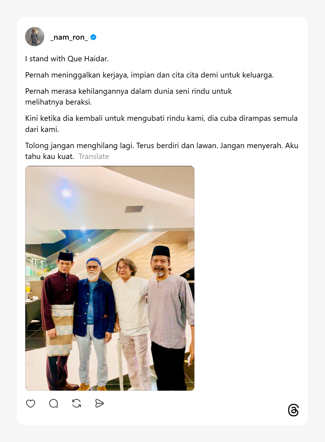 “Dia cuba dirampas semula’, mendalam ayat tu. Terima kasih abg Namron stand with Que Haidar. Hanya jauhari mengenal manikam. Semoga kata-kata baik ni menjadi kekuatan untuk dia comeback stronger 🌹.”