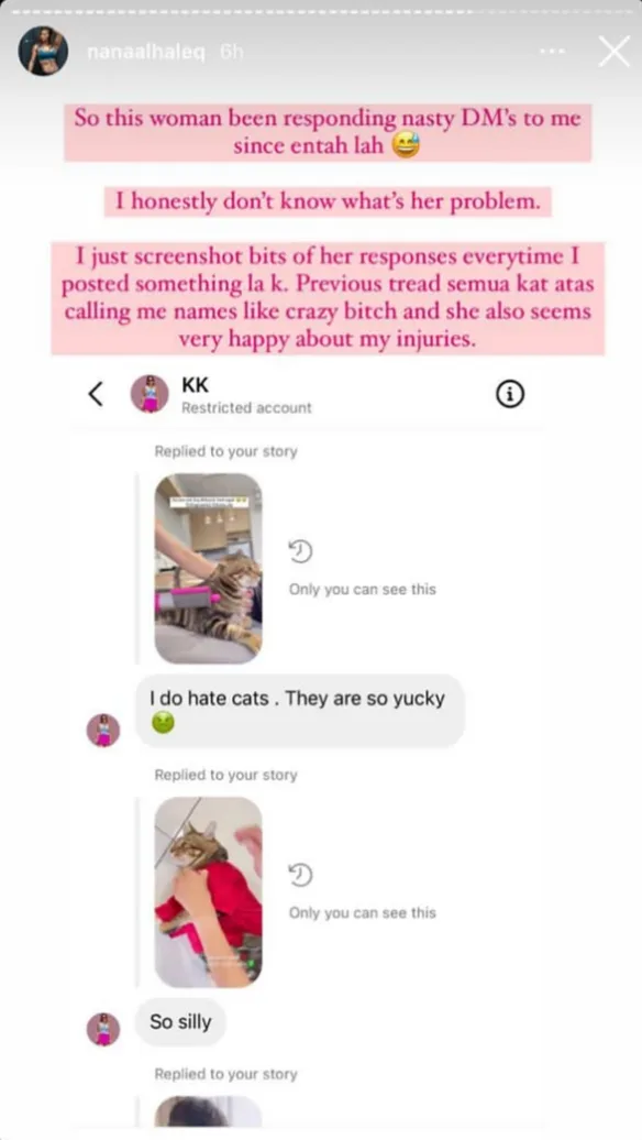 Baru-baru ini, bekas atlet wanita, Nana Al-Haleq, berkongsi di laman Instagram tentang dirinya yang sering menerima mesej yang pelik daripada seorang wanita. Akaun wanita tersebut sering mengganggunya dengan memanggil gelaran yang tidak elok seperti ‘crazy b*tch’ dan seolah-olah suka melihat dirinya cedera.