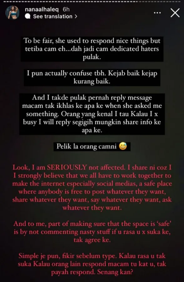 Nana juga turut berpesan supaya fikir dahulu sebelum berkongsi di sosial media dan jangan respond kepada orang lain dengan cara yang diri sendiri juga tidak suka jika mengalaminya sendiri.