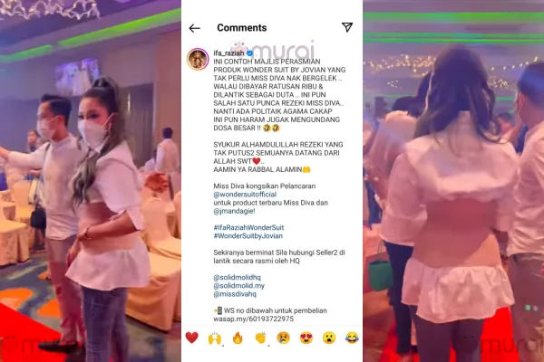 “Ini contoh majlis perasmian produk Wonder Suit By Jovian yang tak perlu miss diva nak bergelek.. Walau dibayar ratusan ribu dan dilantik sebagai duta..” Coretnya