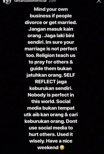 ” Jaga laki bini sendiri. Saya yakin tiada perkahwinan yang sempurna juga. Agama mengajar kita untuk mendoakan sesama sendiri bukan mengajar menjatuhkan orang lain,” katanya yang menasihatkan netizen menggunakan sosial media sebaiknya.