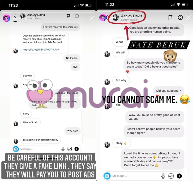 Han yang kini berada di Malaysia berkata, gadis dengan nama Ashley Davis itu telah menghantar DM kepadanya dan dia sedar pemilik akaun itu merupakan seorang scammer yang cuba menipu dengan mengambil wang dari mangsa.