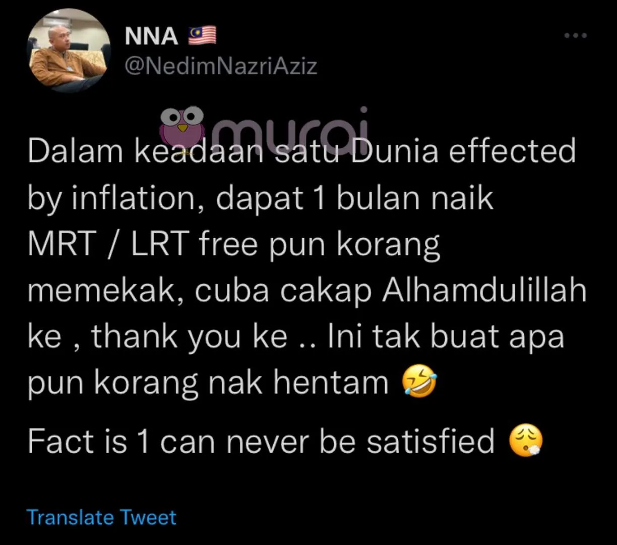 “Dalam keadaan satu dunia terkesan dengan inflasi, dapat 1 bulan naik MRT/ LRT free pun korang memekak.