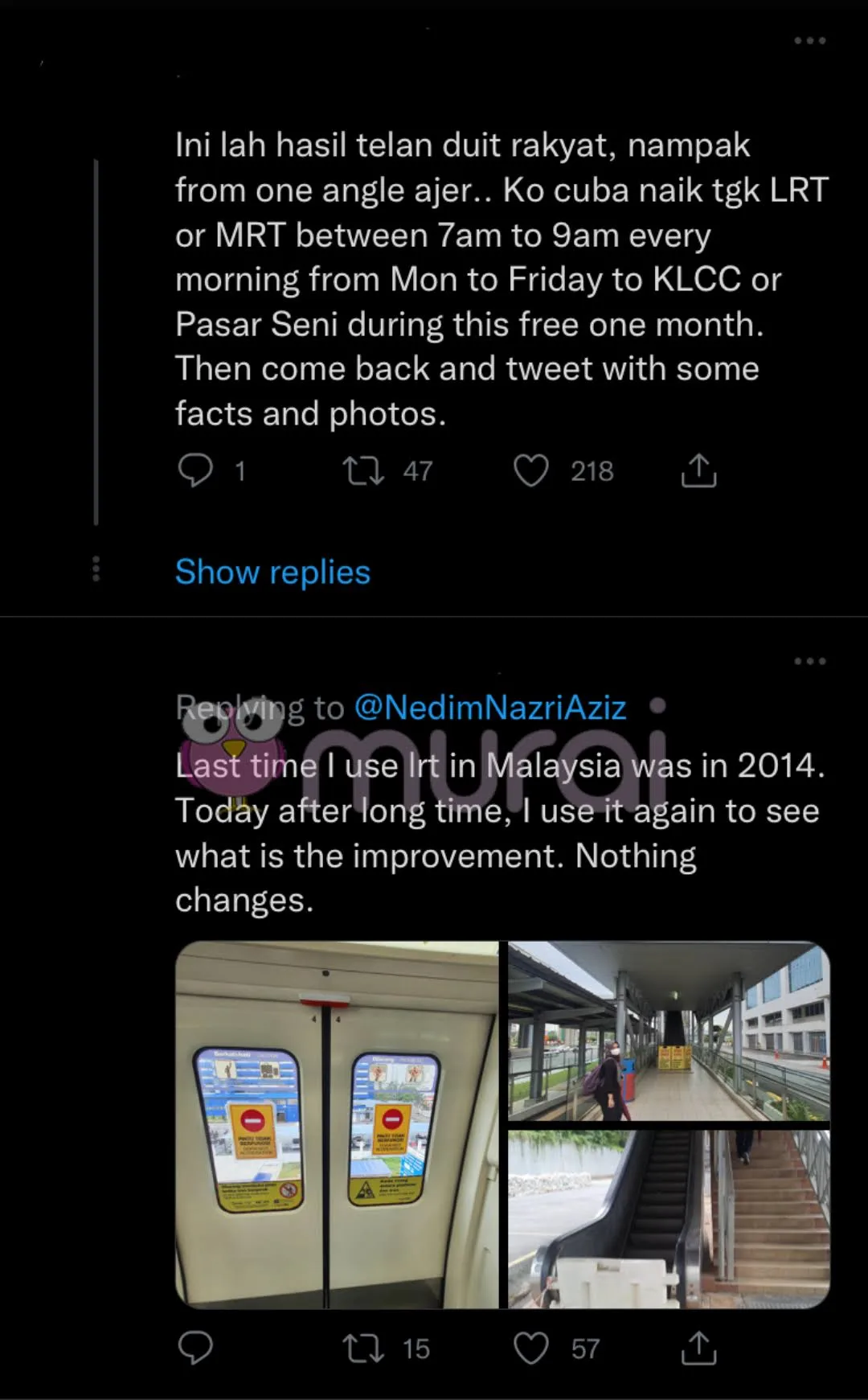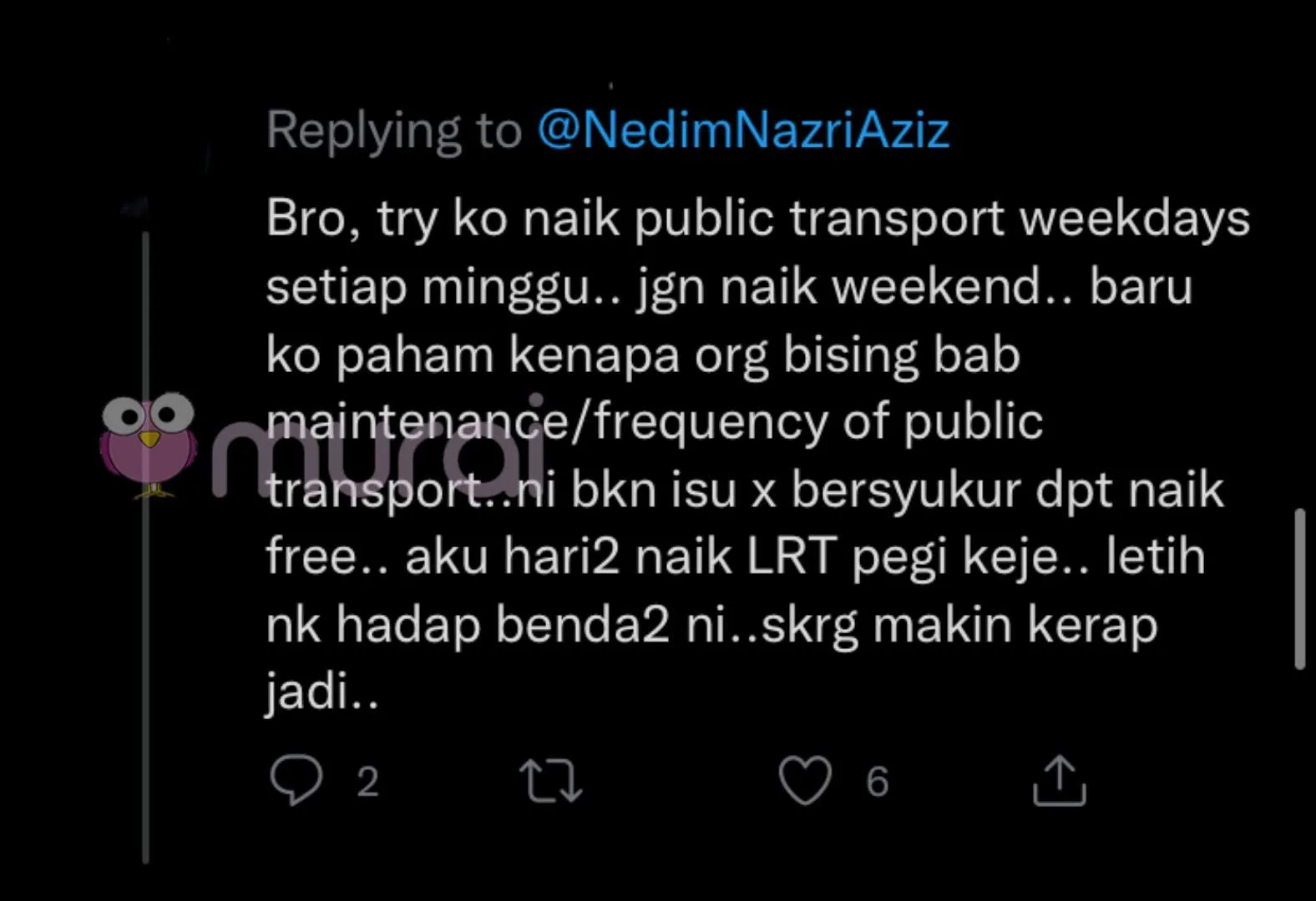 “Bro, kau try naik public transport weekdays setiap minggu. Jangan naik weekend. Baru ko paham kenapa orang bising bab maintenance / frequancy of public transport. Ni bukan isu tak bersyukur dapat naik free. Aku hari-hari naik LRT pegi keje. Letih nak hadap benda-benda ni. Sekarang makin kerap jadi.”