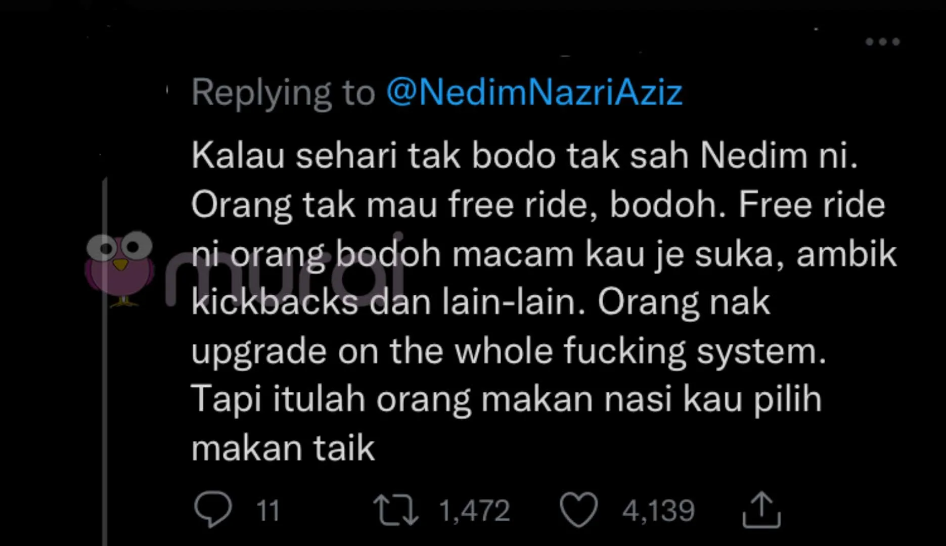 “Kalau sehari tak bodo tak sah Nedim ni. Orang tak mau free ride, bodoh. Free ride ni orang bodoh macam kau je suka. Ambik kickbacks dan lain-lain. Orang nak upgrade on the whole fucking system. Tapi tulah orang makan nasi kau pilih makan taik.”
