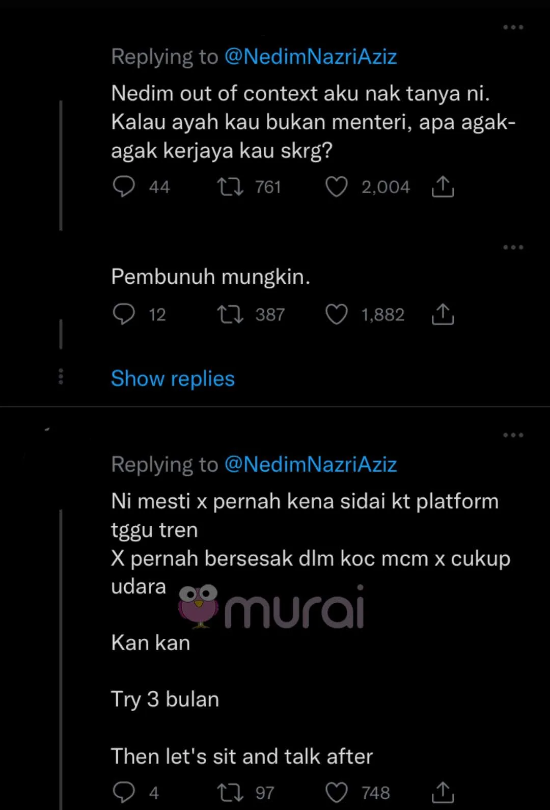 “Ni mesti tak pernah kena sidai kat platform tunggu tren. Tak pernah bersesak dalam koc macam tak cukup udara.”