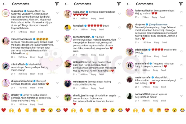 Muatnaik tersebut terus dibanjiri dengan pelbagai komen-komen dari rakan selebriti yang menitipkan doa, agar Nelydia dan suaminya mendapat haji yang mabrur dan dipermudahkan segala urusan sepanjang di tanah suci.