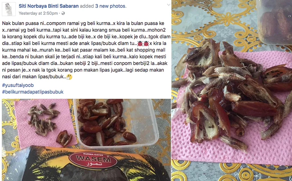 Namun, sejak semalam perkongsian yang dibuat oleh seorang wanita Siti Norbaya telah mengejutkan ramai orang tentang bahayanya jika tidak memeriksa buah kurma sebelum makan. Berikut posting yang dibuat olehnya.