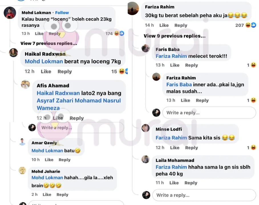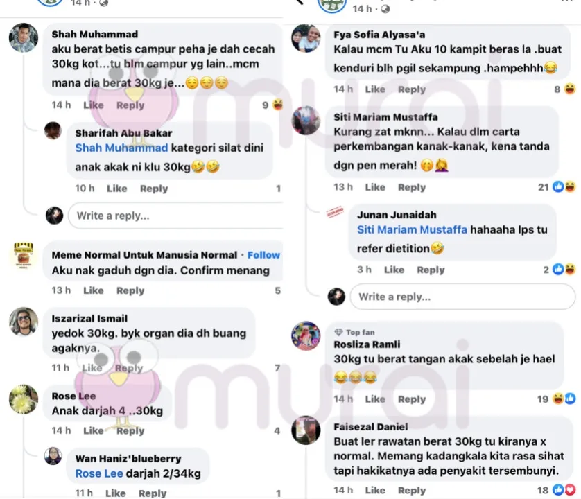 Ada yang samakan berat badannya dengan anak-anak mereka, ada juga yang samakan dengan sebelah kaki mereka. Namun hampir kesemua komen di situ gurauan semata-mata. Selain itu ada yang memberikan nasihat supaya buat rawatan susulan oleh kerana berat yang tidak seimbang itu.