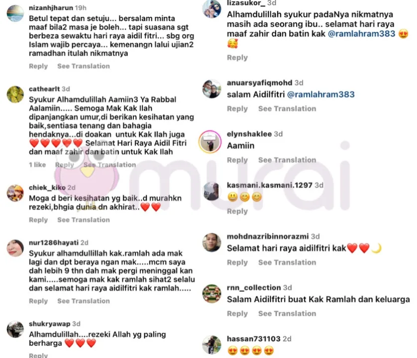 Gambar yang dimuat naik oleh Ramlah Ram itu, mendapat perhatian dari peminatnya. Ada yang komen mendoakan Ramlah Ram dan ibunya, ada yang yang sebak melihat gambar tersebut kerana mengingatkan kepada arwah ibu mereka.