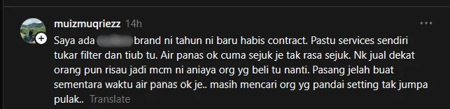 Namun, segalanya berubah selepas peralatan itu diterima dan cuba dipasang sendiri. Masalah kebocoran mula timbul, dan penjual hanya memberikan panduan melalui video tanpa bantuan lanjut. Lebih mengecewakan, komunikasi terputus selepas itu, malah mereka turut disekat.