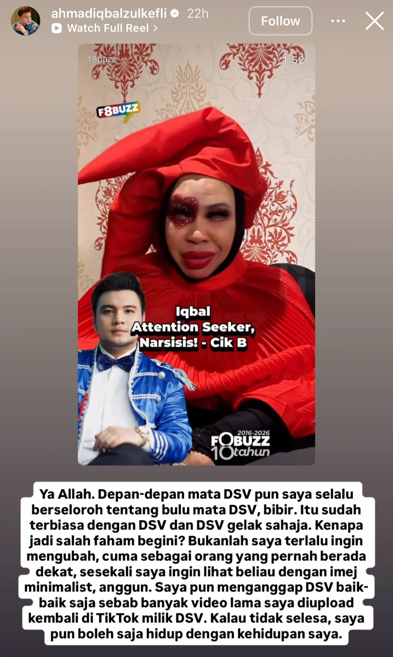 Iqbal menerusi hantaran di Insta Stories, menjelaskan bahawa niatnya hanyalah mahu melihat DSV untuk hadir dengan imej yang lebih sopan dan anggun.